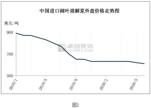 2020年上半年溶解漿價格窄幅下行,國產闊葉溶解漿含稅到廠價均價5377元/噸,較去年同期下降23%。從圖1可以看出今年上半年變化幅度不大,去年四季度漿價已降至近五年新低,來到國產漿廠生產成本線附近,幾無調價空間。2020年一季度受到公共衛生事件影響,溶解漿市場交投清淡,國產漿成交價低位盤整。二季度終端出口訂單減少,溶解漿市場延續弱勢運行,漿價承壓窄幅下行,5月份國產闊葉溶解漿含稅到場價下探至5300元/噸。漿價持續低迷原因是: