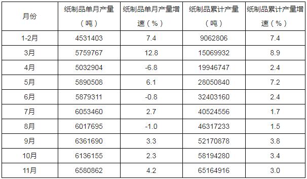 根據國家統計局數據顯示:2019年11月中國紙制品產量為6580862噸,同比增長4.2%;2019年1-11月中國紙制品產量為65164916噸,同比增長3.0%。