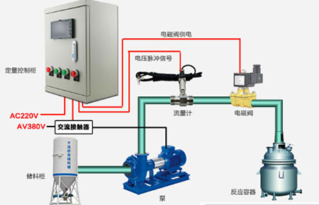 整個系統,定量計量開始時,定量控制儀指示電磁閥開啟,流體進入流量傳感器。一般的流量傳感器,工業上通常會選用脈沖輸出的渦輪流量計,以保證數據的響應速度,當然有些設備為保證精度會采用電磁流量計。流量傳感器將流量信號傳給定量控制儀并開始計量,當流量達到設定值時,定量控制儀發出指令使電磁閥、水泵等斷開(可同時控制電磁閥、水泵,也可單獨控制),恢復到初始的關閉狀態,從而實現了水量的定量控制。