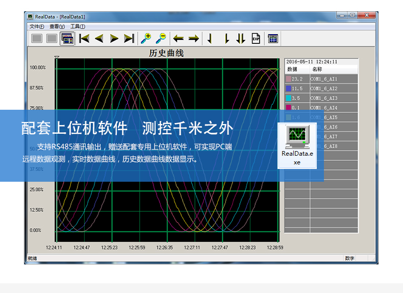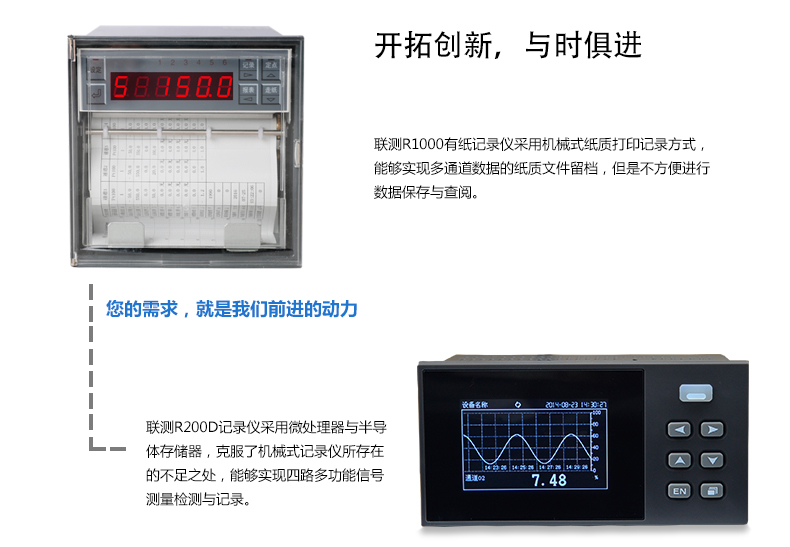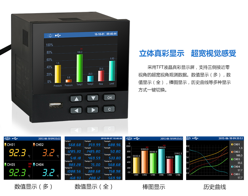 無紙記錄儀是將采集的數(shù)據(jù)/運算數(shù)據(jù)以時間為基軸記錄在儀器內(nèi)部的存儲系統(tǒng)中,無消耗任何常用的記錄設施,如:紙張、筆墨。記錄在儀器內(nèi)部的存儲數(shù)據(jù),通過運算、模擬后顯示在液晶屏。常用顯示用液晶屏比較廣泛。在液晶屏屏幕上,可以顯示數(shù)字顯示、棒圖顯示、曲線顯示、報警列表等。無紙記錄儀采集的數(shù)據(jù),常用的有:溫度、壓力、流量、液位、電壓、電流、濕度、頻率、振動、轉(zhuǎn)速等。