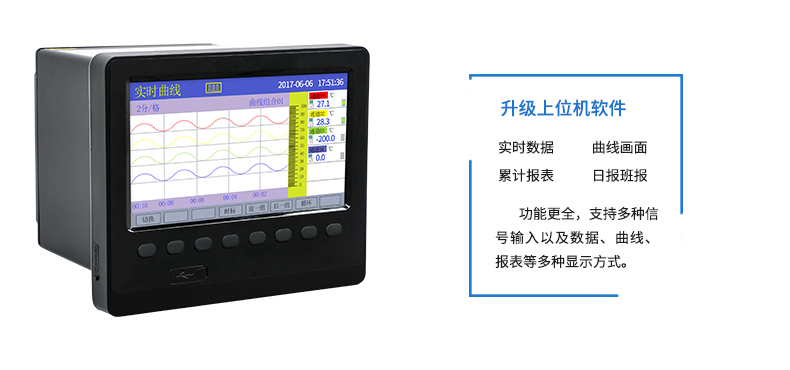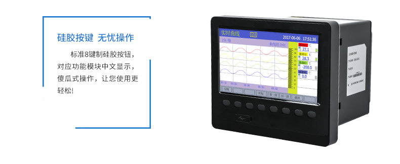 無紙記錄儀是將采集的數據/運算數據以時間為基軸記錄在儀器內部的存儲系統中,無消耗任何常用的記錄設施,如:紙張、筆墨。記錄在儀器內部的存儲數據,通過運算、模擬后顯示在液晶屏。常用顯示用液晶屏比較廣泛。在液晶屏屏幕上,可以顯示數字顯示、棒圖顯示、曲線顯示、報警列表等。無紙記錄儀采集的數據,常用的有:溫度、壓力、流量、液位、電壓、電流、濕度、頻率、振動、轉速等。